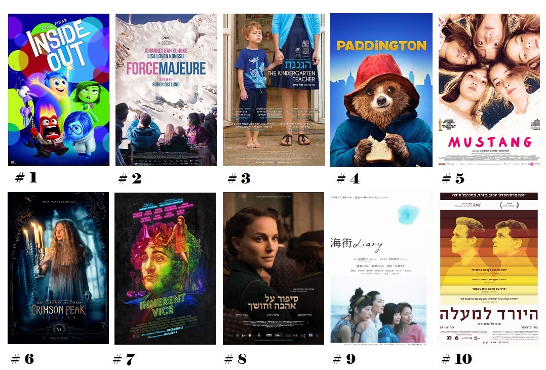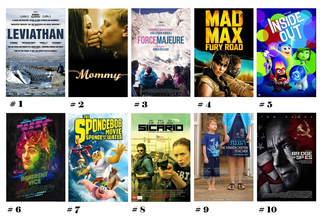 השנה ראיתי 55 סרטים, הישג שאני מחשיב כדי מרשים, במיוחד כי את רובם ראיתי בקולנוע וכי להיות תלמיד זה לא קל במיוחד. מבחינתי 2015 הייתה שנה ממש מוצלחת לקולנוע בעיקר מכיוון שאחוז הסרטים שבו הגבתי לסרט מבחינה גופנית, הרבה לפני המחשבה אם אהבתי אותו או לא, הוא גבוה מאוד.