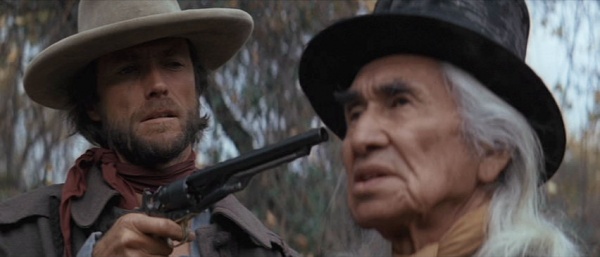 דווקא הסצנה הראשונה בסרט אשר מפגישה בין וויילס ואינדיאני, לון וואייטי בגילומו המעולה של צ'יף דן ג'ורג' (שכמה שנים לפני כן היה מועמד לאוסקר על "איש קטן גדול"), כתובה ומשוחקת באופן מוצלח הרבה יותר, כי היא מראה את הסדקים שהתגלו בעולם החד-משמעי עד כה של אמריקה. "אני אידיאני מתורבת" אומר וואייטי לוויילס ומוסיף, "מאז שתורבתי שכחתי לאן ללכת". איסטווד מציג את הצדדים השליליים של כיבוש וכפיית דרך חיים חדשה על תרבות אחרת, ושוב, ויטנאם.