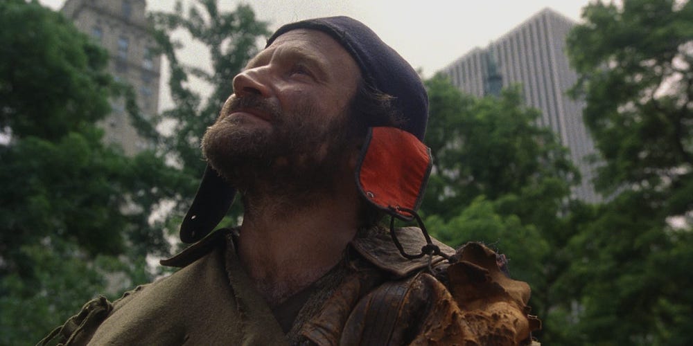 אומנם וויליאמס יכל לשחק גם דמויות אפלות יותר כמו ב"חיים בתמונות" וב"אינסומניה" (והוא היה הדבר הכי טוב בסרט הכי פחות מוכר של כריסטופר נולאן), אבל הכוח של הסרטים הללו הוא החתירה לא רק נגד התדמית של וויליאמס, אלא גם נגד התחושת של הקהל הפוגש בו על המסך. וזה נכון גם כאשר הוא מתנהג בצורה לא מוסרית עד מחליאה. כאשר הוא מבצע דברים שמידת הצדק בהם היא על התפר, האישיות שלו סוחפת את הקהל להזדהות יותר מאשר לכיוון של רתיעה. זה גם המקרה ב"פישר קינג".