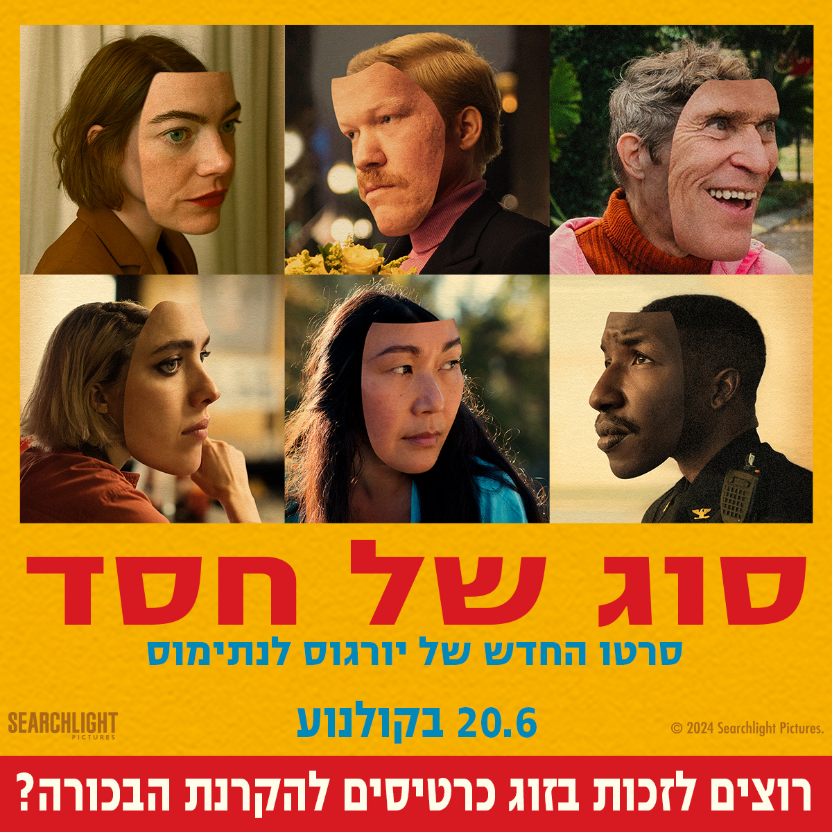 מזמן לא חילקנו כרטיסים לאיזה סרט, והנה נפלה בחלקנו הזדמנות לעשות בדיוק את זה. ולא סתם סרט, אלא שיתוף הפעולה החדש של יורגוס לנתימוס ואמה סטון, טרי ומהולל מבכורה עולמית בפסטיבל קאן לפני חודש בקושי. קוראים לו ״סוג של חסד״ (Kinds of Kindness) והוא עולה לאקרנים בישראל, יחד עם שאר העולם, ממש ביום חמישי הקרוב (20.6). אבל אנחנו מציעים היום ועד גמר המלאי משהו יותר בלעדי – להצטרף לבכורה! ההקרנה תתקיים בערב של יום שלישי ה-18.6, בקולנוע פלאנט איילון (רמת גן), ופרטים מדויקים יימסרו בהמשך לזוכים ולזוכות.